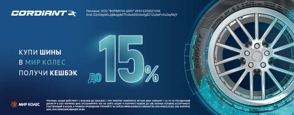 10% (десять процентов) на летние шины Cordiant с 17 по 18 дюйма при покупке с 01.05.2026 г. по 30.06.2026 г. включительно,